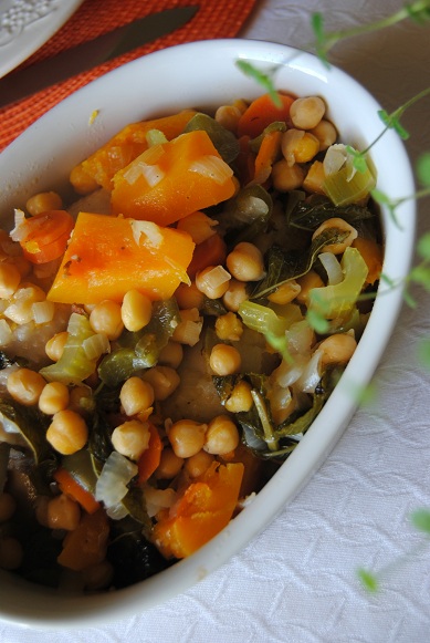 Neste caso, comecei por fazer um refogado de cebola (3) picada e azeite a que acrescentei depois de alourada a cebola, 3 dentes de alho, 3 cenouras e 3 talos de aipo fatiados. Adicionei ainda ramos de hortelã e um frasco de grãos pré-cozidos. Claro que a isto tudo juntei água e sal. Por último, coloquei pedaços de abóbora cortados e duas pernas de frango. Deixei ferver 20 minutos e tinha o almoço pronto.